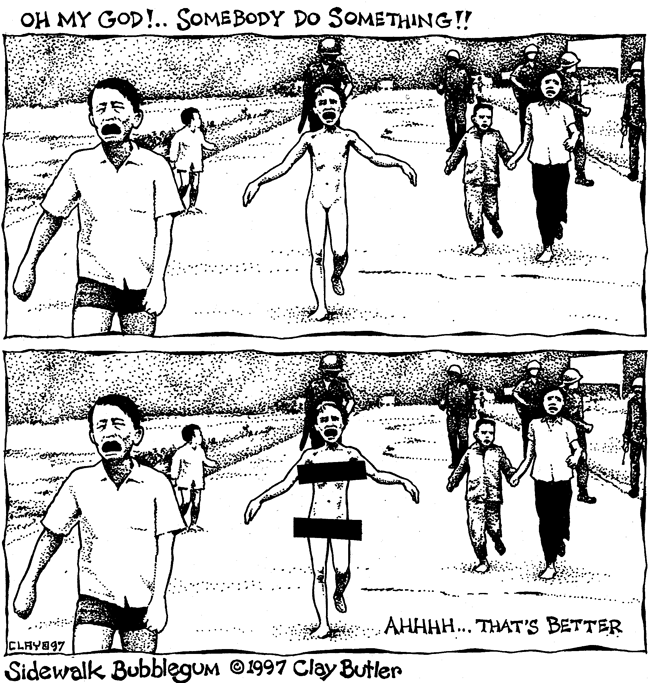 The sound of prideful theme music fills speakers with trumpets, violins and other angelic instruments. You could picture a group of soldiers running or an American Flag nevertheless the real image was a fast-paced selection of previous wars that America intervened in. The commercial connects to a theme of strength, nationalism and militarism. Such as the image that I found that shows the prominent girl running in Vietnam on June 8, 1972 with no clothes. Surrounding her are other people from her country. Yet, in the far back there are soldiers just walking along guiding them from the rubble not even trying to help them. The young girl who is named Phan Thị Kim Phúc, is looking for faces that she might know or even her own parents. Running and crying pouring out all things she felt from her inside, out onto her scabrous skin. The image is split, to a top and bottom. The top image headline reads“Oh My God, Somebody Do Something!” Her mouth is open as she screams with her minuscule voice for help. In spite of her being the “enemy” she is also a small weak girl, confused and lost she gets the littlest amount of help--censor bars covering her developing breasts and genitals. In addition to the quote in the bottom of the second picture that reads “Ahhh… That’s Better.” Similar to the way we try to fix our problems here in America, with the smallest amount of effort unless it’s through militarism.