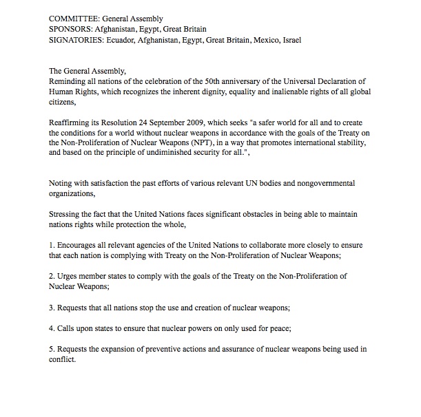This is another sources from United Nations Association of the USA but this one is on resolutions. I gave this to the students in the middle of the course after the position papers were written and the topic for conference was discussed. This source helped to explain the actual purpose of conference. In the long run I want the students to form a resolution as the United nations however, to get to that point each nation must have an idea of what resolution would benefit them the most. I used this source to advise the students on how to go about this.