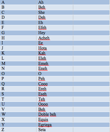 Alphebeto Posted by Thomas Jeffcoat in Spanish 1 - Manuel on Monday, October 31, 2011 at 11:34 am Knowing how to spell something can be very useful learning a new language. Also, pronunciation is a big factor in learning a language. Here is the alphabet...Screen Shot 2011-10-19 at 12.43.41 PMHere is a video of a real life situation...Here are my pareja's (Bryanna) three lessons:1) Días de la Semana2) ¿Qué tiempo hace hoy?3)La Fecha Comments No comments have been posted yet. Log in to post a comment.