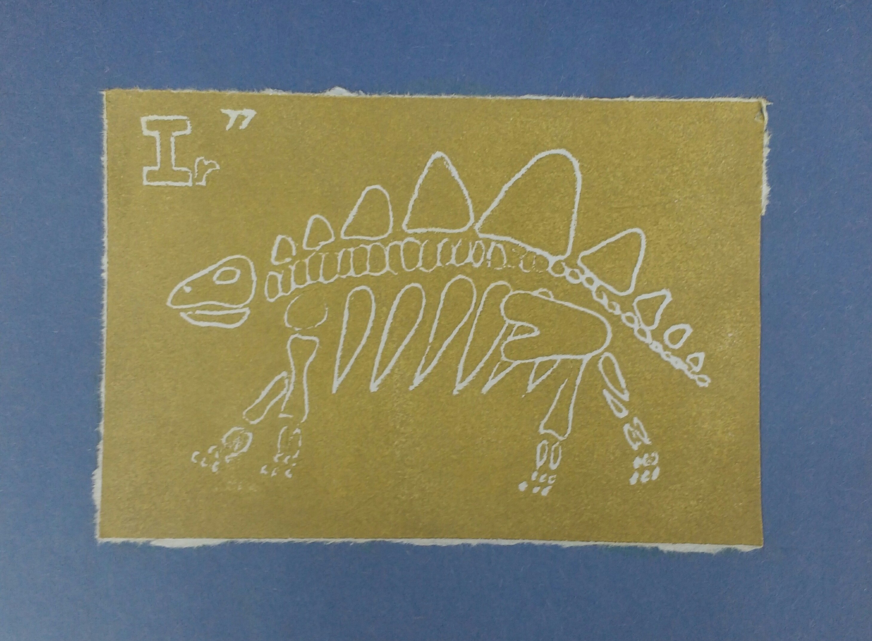 For my print, I got the idea to do the skeleton of a dinosaur. The reason why I picked this was because of the Alvarez Hypothesis. This said that an object collided with the earth 65 million years ago, making many species extinct (dinosaur's being an example.) During the time when this object is said to have collided with the Earth there are high levels of iridium in the Earth's layer. Because of this, I decided to do a print of a dinosaur skeleton to symbolize the hypothesis of the extinction of dinosaurs. To create my print, I really tried to create a drawing that would be easy to see but eye-catching at the same time. I really tried to make the lines deep so that they would stand out in my print. After, I had to trace my drawing so that it would be backwards on the foam but forwards in the end. We then rolled a layer of paint over our foam and put a piece of paper on top to smooth it onto the paper. If I could do my prints gain I would take more time making sure that the lines didn't have paint in them and that they are bold so that people can really tell what my print is of. I would also add the atomic number of my element way bigger because it was really hard to make a print in which you could see the number clearly. A step that I really enjoyed was the actual printmaking process because it was really fun to be trying to create a good print and testing different paint colours.