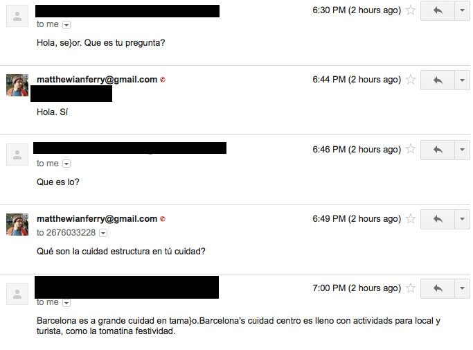 For this week my partner was Miguel, someone who I met through Livemocha. Me and my partner chose to do our communications via e-mail, as we saw it was the most convent way for both of us. My partner told me to censor out his e-mail when I told him I would be uploading the screenshots of our conversation. To respect him, and have him as someone for possible conversation with, I have upheld his request.