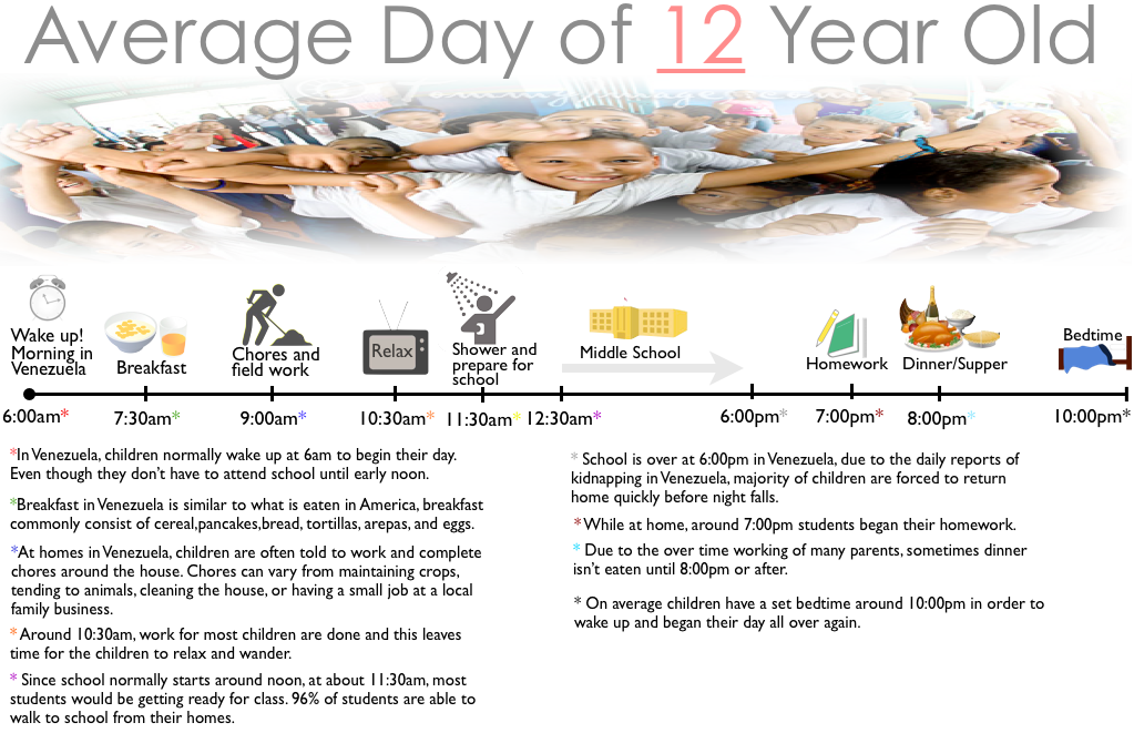 After completing this assignment, I realized that the average life of a 12 year old boy in Venezuela is much different from what my life was like when I was 12. For one most 12 year olds in Venezuela work in order to help provide for their family. When I was 12, working was the last thing on my mind. I also was surprised that in Venezuela, most schools began session at noon and ended around 6:00pm. I thought that this was interesting because the high kidnapping rate should have enforced school officials to change school hours. I expected to find that the kids would have some sort of labor once in throughout their day because I normally read about child labor in South America. I think that when a Venezuelan Boy is 40, he would have more work ethic because he began working at such a young age. That's the only thing that I believe will remain the same. 70% of college students in Venezuela will become the most wealthiest people in their country.