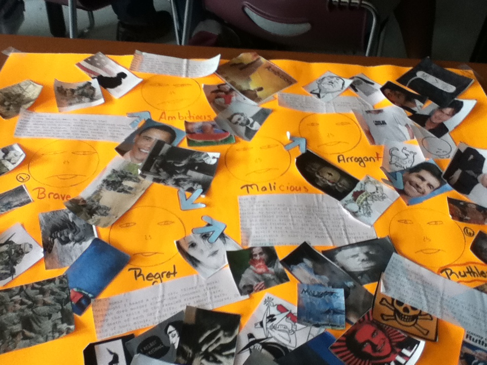 I did a collage on the six different personalities of Macbeth. I drew six different Macbeth heads around my board. I then printed out pictures that represented his personality. For example, he was very brave so I printed out pictures of soldiers to represent bravery. I glued the pictures all around the head that represented bravery. I did the same thing for the other five personalities. I also put quotes around the heads. The head that represented bravery had the quote in the book that made me believe he was brave. I did the same for the other heads as well.