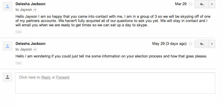 After talking with our teacher we started to get moving along with the process because she gave us some ways to contact different people in the Bahamas. After sending out emails and days of waiting a response we finally got one from a teacher. She then forwarded this email to someone in the class who was willing to talk to us about the election process. We exchanged emails but we didn't really get information we were suppose to skype and interview him but things got hectic with other work. So this project wasn't really successful although we did get in contact with him we didn't really get the information.