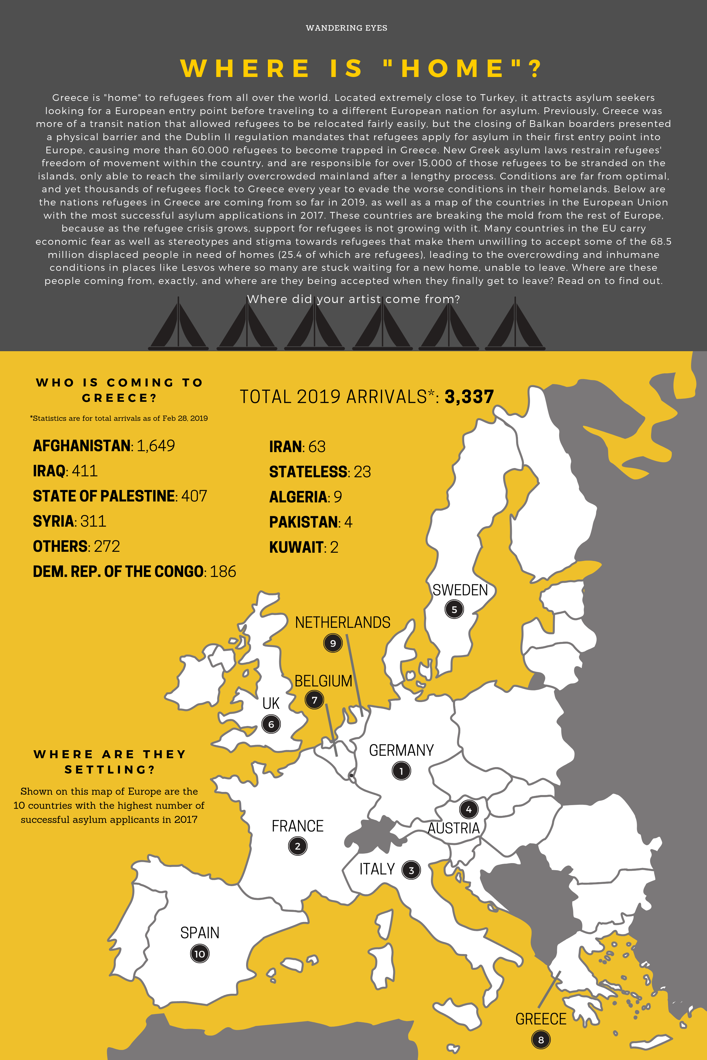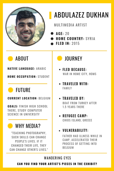 For my capstone, Becca and I created WANDERING EYES, an interactive photography exhibition/fundraiser celebrating the work of refugee photographers who have gone through a ReFocus photography and media workshop in Lesvos, Greece during their wait for asylum. After traveling to Greece last summer as teaching artists for the workshops, Becca and I knew we needed more people to get a taste of the hands of experience we were lucky enough to have in order to give people a personal connection to a pressing crisis that often feels distant. For our exhibition, I wrote and designed large informational posters that lined the walls and gave viewers a look inside the refugee crisis and the situation in Lesvos, smaller directional signs to guide viewers through the experience, 8 detailed artists cards to connect viewers to the artists and their work, and postcards for sale and business cards distributed at the event. In addition, I edited together interviews of the teaching artists and artists found on the artist cards and put them into a website for a projection room at the end of the exhibition. I also managed our email and newsletter, handled poster distribution, and made connections with local businesses that supported our project and printed our photos and cards for a fraction of their original costs. I took on a lot for this project and lost a lot of sleep, but I learned so much about graphic design, networking, marketing, and my personal work ethic and I am more proud of this exhibit than anything I have ever done before. Over 100 people attended, and the feedback we received made it clear that we gave our community a better understanding of the conditions refugees face and the power of art amidst crisis, and raised hundreds of dollars for the workshops and helped show Americans what refugees are capable of.