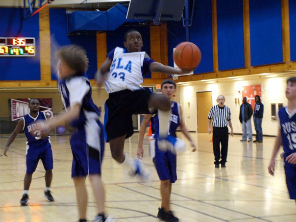 The Science Leadership Academy Boys Basketball team registered their first victory of the season on Tuesday with a win over the Arts Academy @ Benjamin Rush, 71-52. SLA was led by junior Sam Kabangai with 16 points and junior Tyler Hankinson with 13 points and 10 assists. SLA was leading at halftime 33-24, and then put the game away, out-scoring Rush 22-12 in the third quarter.
