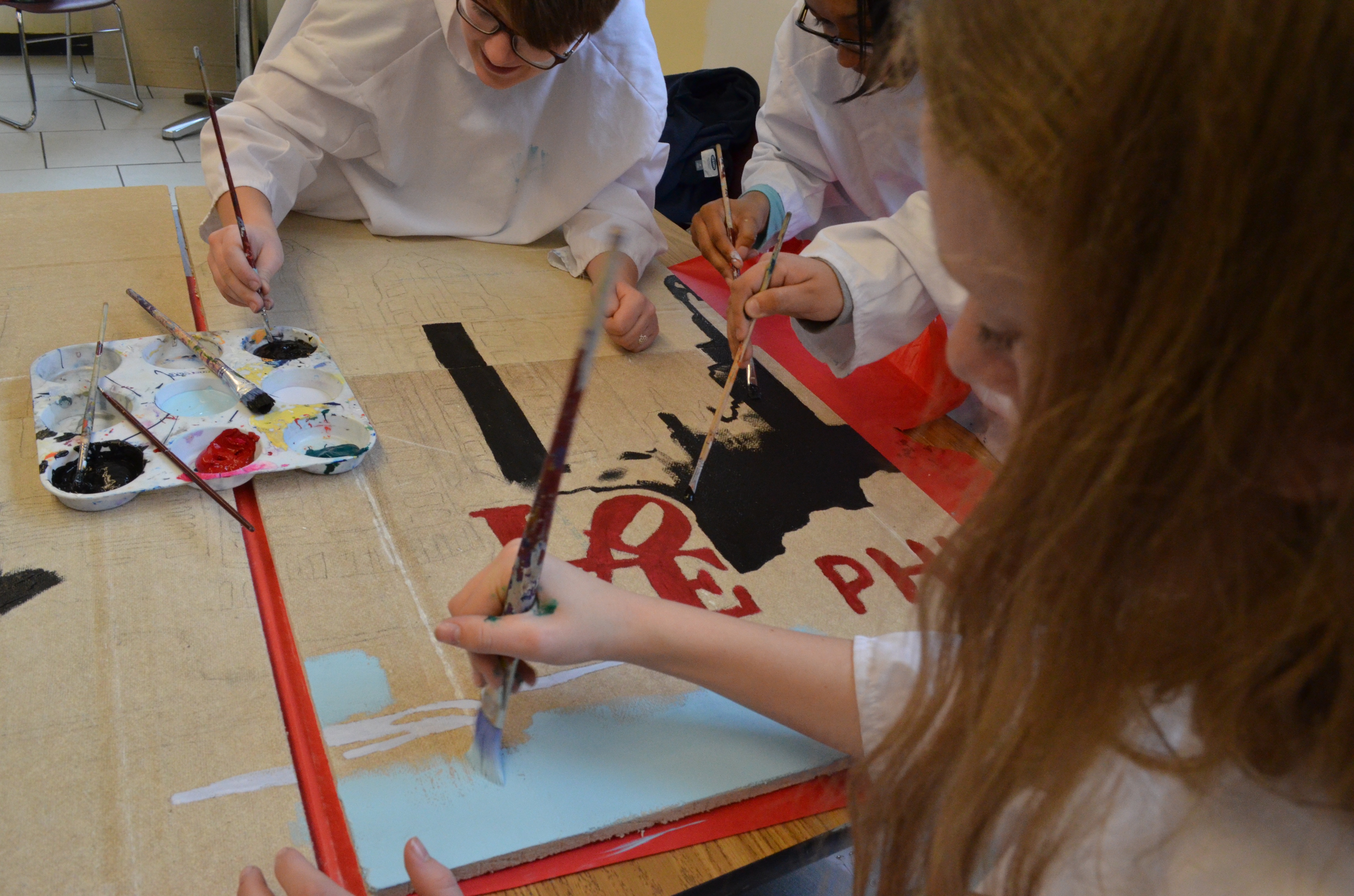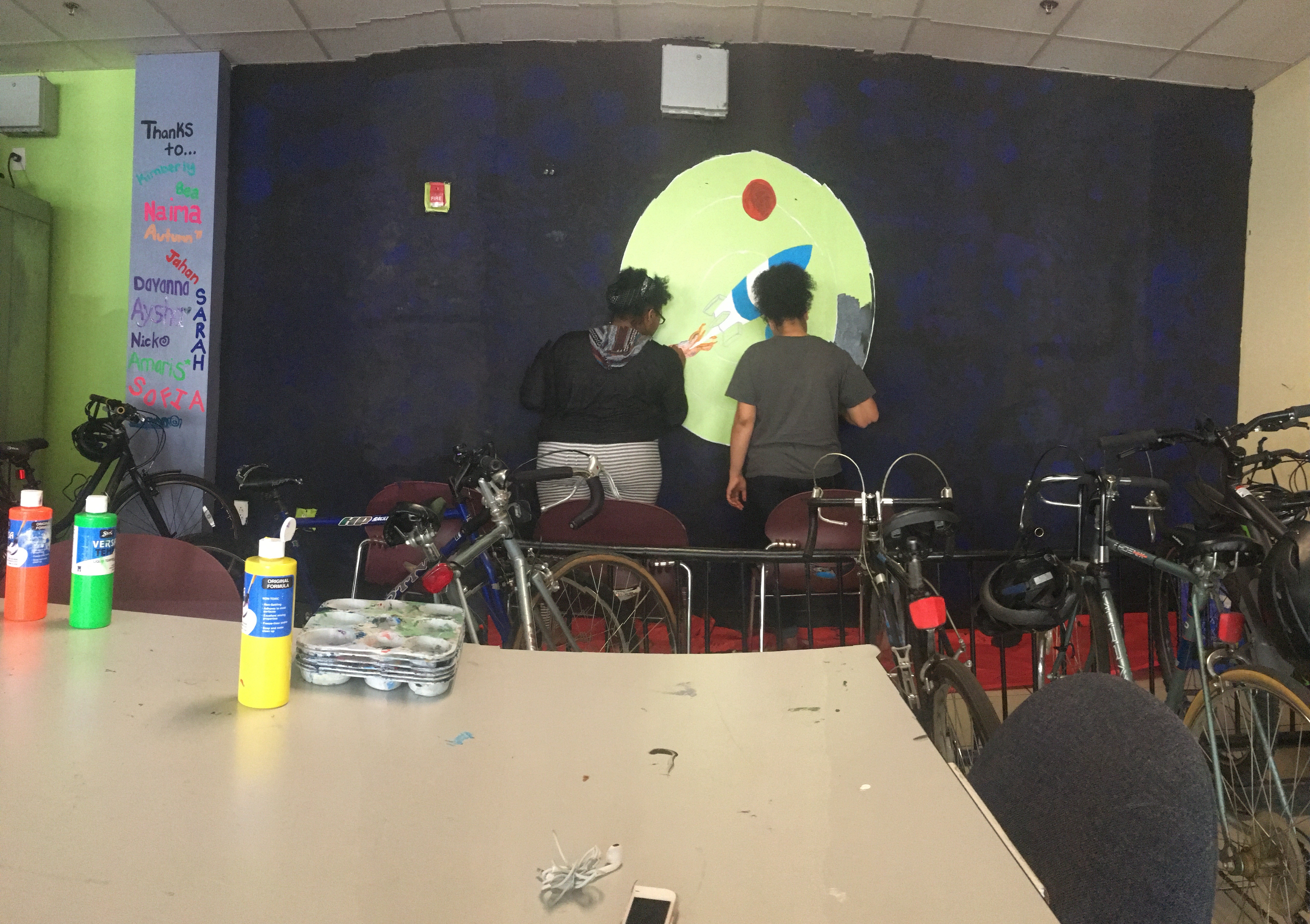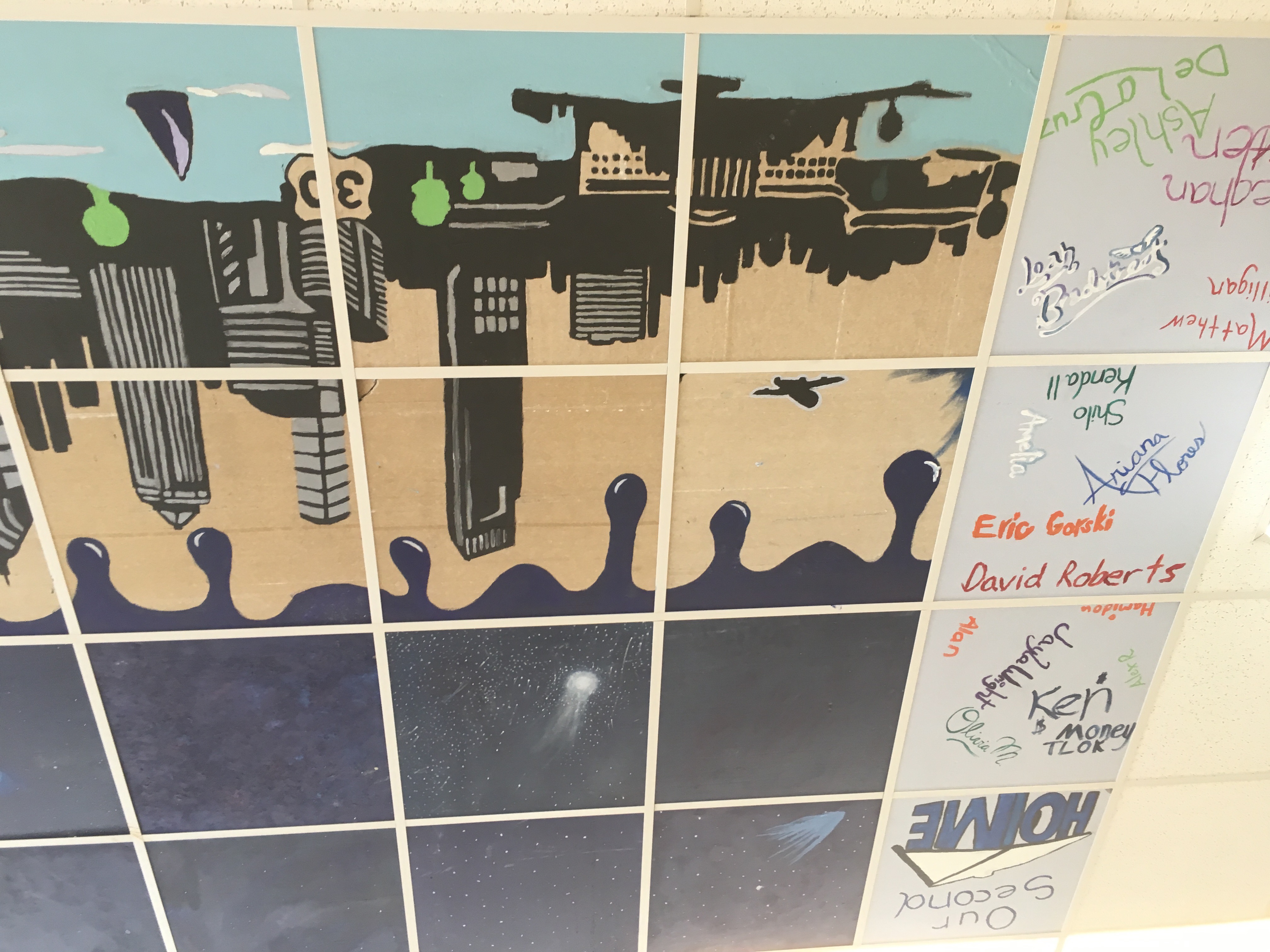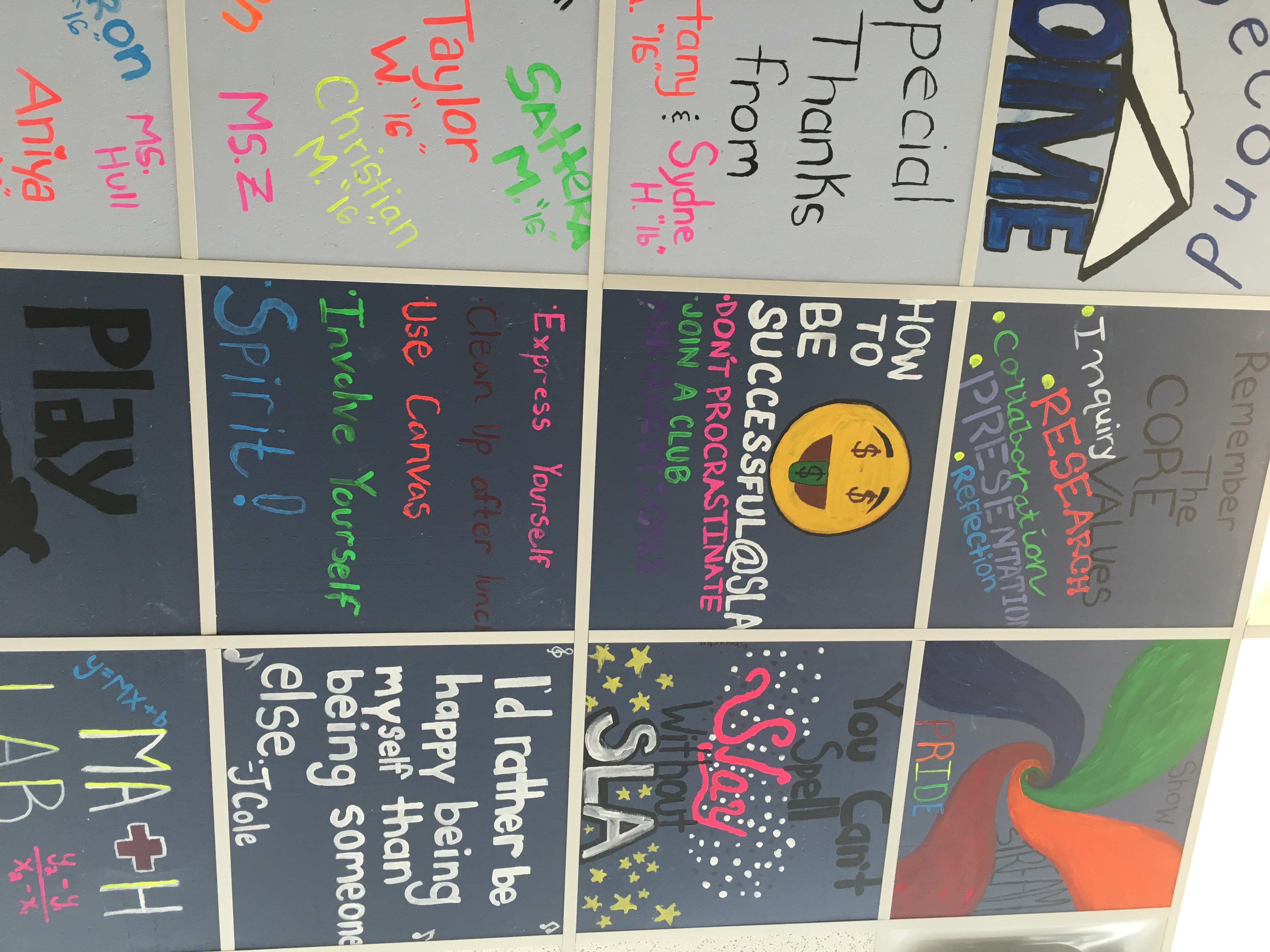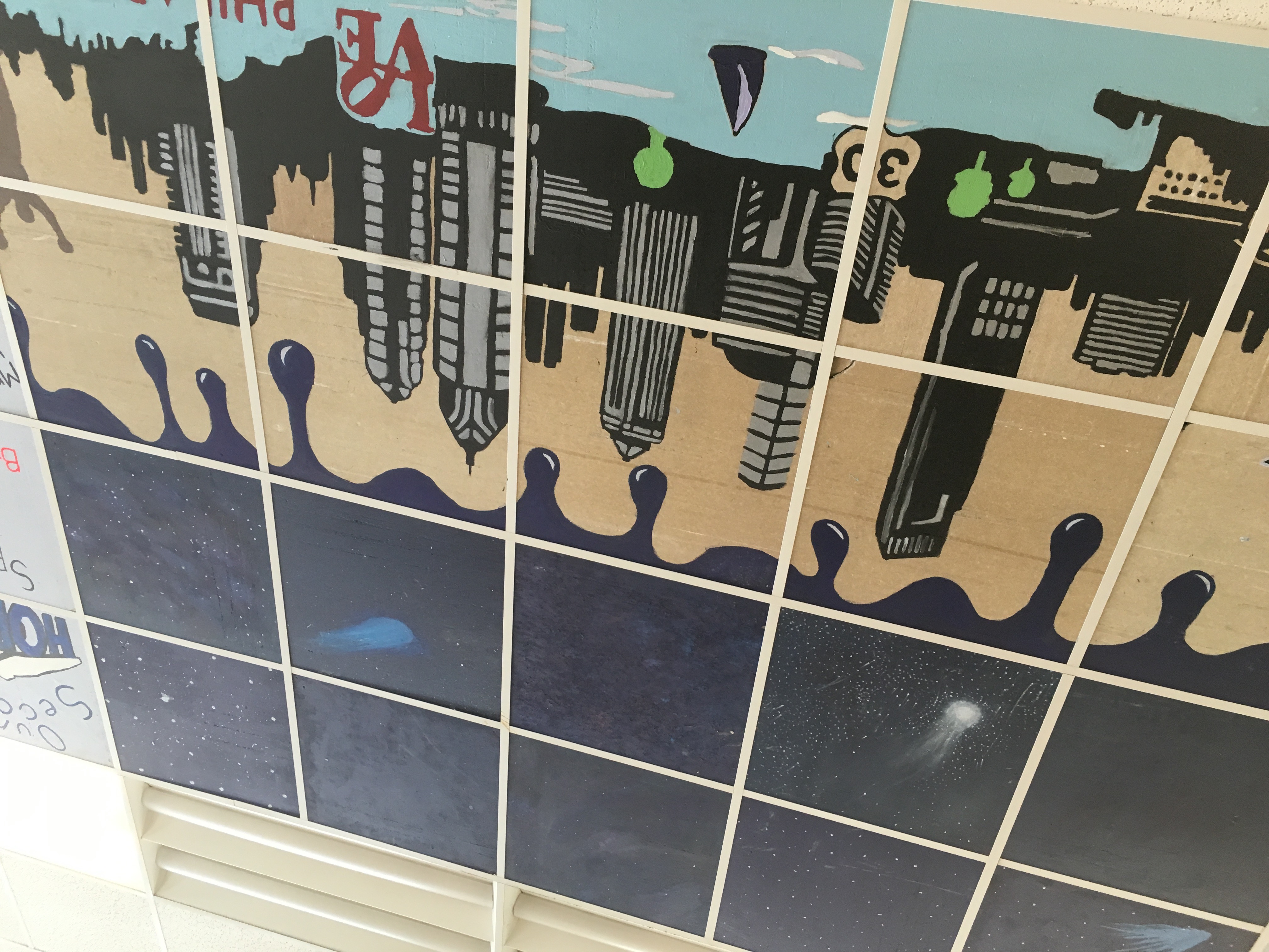 For my capstone, I wanted to add to the SLA art community but I didn't want to be the only one to put my name on a wall or ceiling for that matter. I thought it would be a great idea to properly welcome our freshman in a way that will make them feel like they are finally accepted, so my partner, Sydne Hopkins-Baker, and I started a two semester mini course with The Franklin Institute. During this mini course, students were able to express their ideas of what they want to see in our school based on all of the art work they have seen so far. After 1-2 weeks of collaboration and brainstorming, we started the art piece of their choosing and learned new techniques that dealt with texture, shadowing, and just creating something large with 14 other people. The product of the first course was a beautiful ceiling tile mural of Philadelphia's skyline in space. It showed that the people in our class really enjoyed being in SLA and even named the piece, "Our Second Home." During the second class, the students were more interested in doing a wall art piece, which expresses how far SLA students can go in and out of this world and showing that to every visitor that comes in our school. Photos can be seen below.