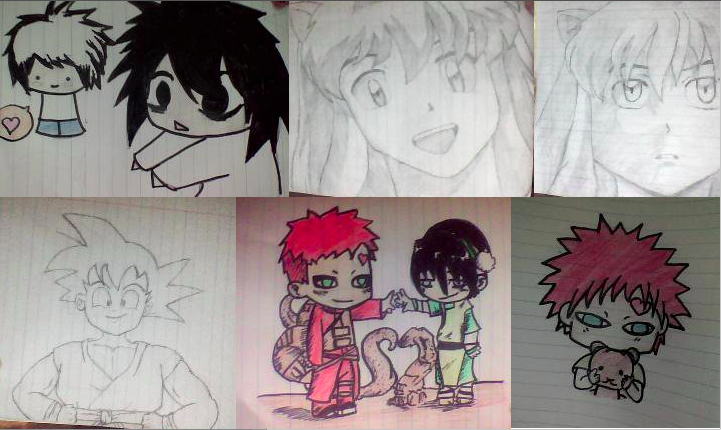 For my second quarter art project I did what I did naturally, draw. I love to sketch and especially sketch anime characters. Lately I've been really nerdy watching all my old cartoons from when I was younger and it gave me the inspiration to try drawing like the professionals. These pictures aren't very creative but I chose to do this type of assignment to test my skills as an artist. The pictures show something about myself as well. Each one is my favorite character from a specific show. The progress of my artwork is each individual picture. I found that it would simpler, instead of taking picture line by line, to take each picture and make a collage.
