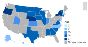 Below is a map of the United States, that shows the minimum legal age for marriage. It also shows the 25 states that don’t have a legal minimum age.