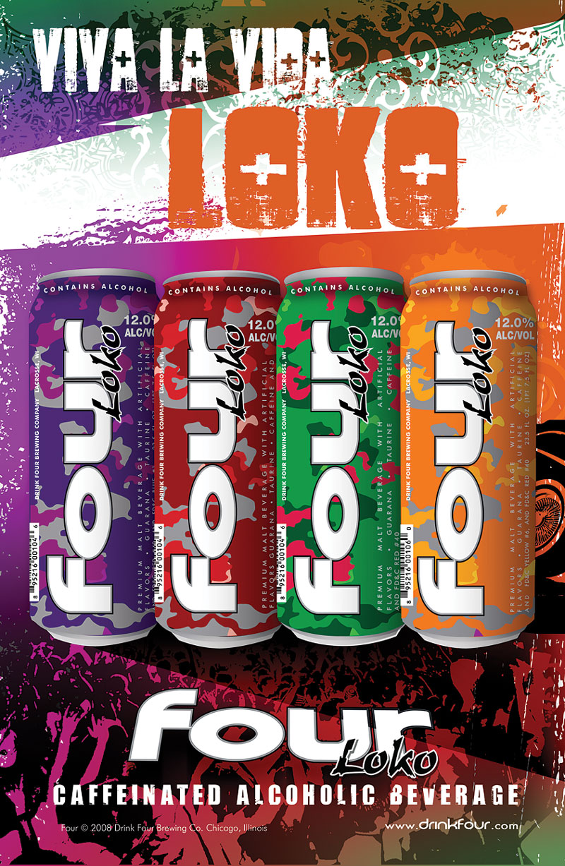 El publicidad tiene muchos colores brillantes, y todo se parece tachó y confuso, como graffiti. Ese es parte del imagen de Four Loko como una parte importante de una vida salvaje y loco, con mucho divertido y emoción. Hay cuatros latas de Four Loko en sabores diferentes en el centro del publicidad. Por encima de las latas, dice “viva la vida loca” en letras de molde, que también parece como graffiti. Debajo de las latas, hay un negro y rosa imagen de un multitud gigante, específicamente un multitud en un concierto. En frente del imagen del multitud es el logotipo de Four Loko. Debajo, más pequeño, dice “bebida alcohólica con cafeína.” Debajo de eso, más pequeño, es el sitio de web de Four Loko, y el nombre del compañía de la elaboración de la cerveza.