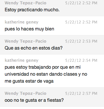 Katherine was a stranger before i meet her in LiveMocha and since then talk alot and alot when we have time and when we are both on skype she has help me practice with my spanish by only writing to be in spanish and me writing back to her in spanish as well. She has been a big help too me.