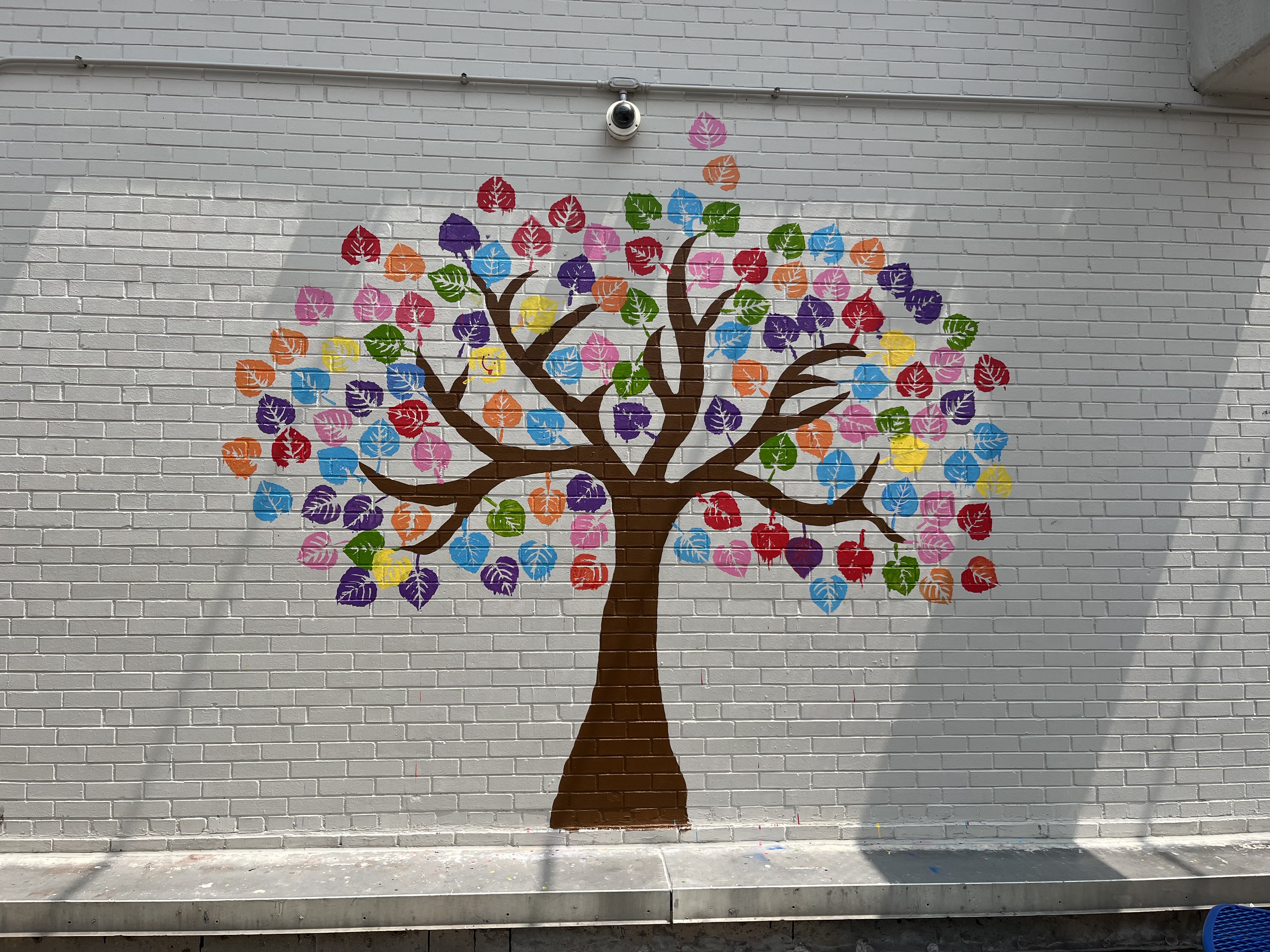 For my Capstone project, I created a collaborative mural that helps brighten the walls at our new school building. I came up with multiple ideas like doing a mosaic tile mural but due to time constraints I landed on doing a much simpler mural. I also had to come up with multiple sketches for my mural taking heed to the feedback that was given. I did have a couple of setbacks when completing the project like having to change mentors. But I’ve learned to push through them and come up with a solution and continued working on my mural. I traced the tree with a projector to create perfect lines so I could paint over them. I also made stencils of the leaves for the tree by using the cricut machine. It took me three days to complete the trunk of the tree. Then after spring break, I had the senior class start to paint their leaves. Several changes were made in the beginning due to different trials and errors when it came to having the seniors paint . But what was once an empty boring wall now has a mural of a tree with beautiful, colorful leaves that the Senior 2023 class will leave behind in SLA history.