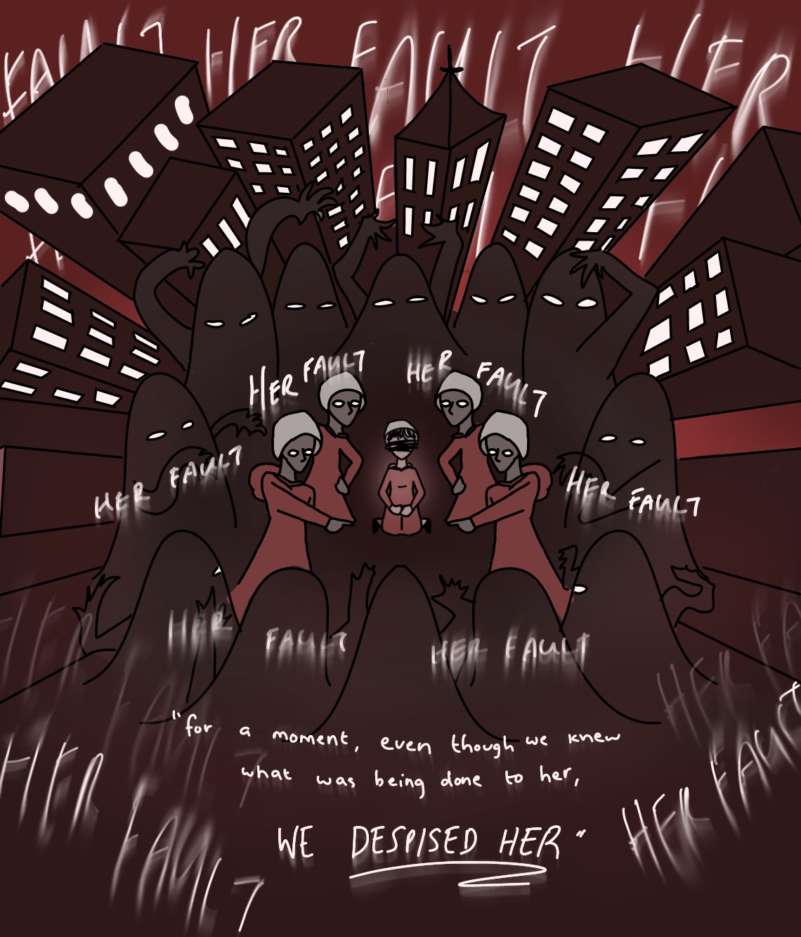 Artist Statement: This image depicts the scene on pages 71-72 of The Handmaid’s Tale. Janine is in the center, small as can be, while the girls around her point accusingly. Janine shrinks under their hurtful gaze, their faces graying into anonymity because their personal identities are not relevant to her pain. They are a single entity that taunt her, not because of who she is, but what was done to her. To them, she has been reduced to a nasty word; comparatively, the girls have been reduced to bullies.