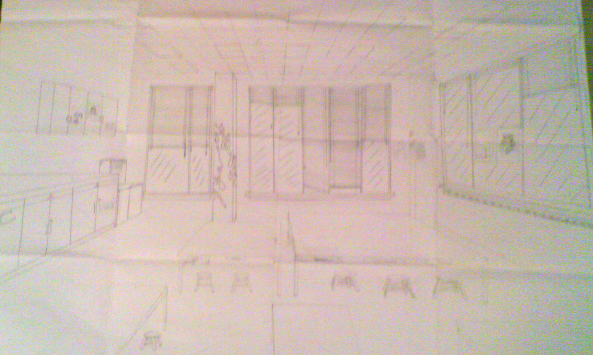 The project was to draw the art room. In order to do so first we had to apply what we learned from the first class which was drawing boxes around the vanishing point and and drawing orthagonals lines from the boxes to the vanishing point. Then you had to apply what we learned from the other classes which was making objects look 3D. And when you put all that together you get this art project.