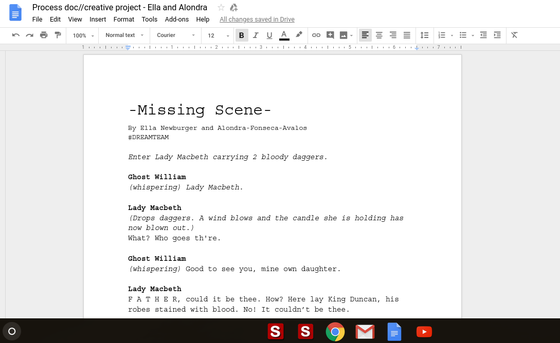 This scene takes place in Act 2.2, right after Macbeth had just killed King Duncan. Macbeth came out with 2 bloody daggers and because he refused to go back and return them, Lady Macbeth had to go and return them herself. While inside the room, she experiences some strange and supernatural happenings.