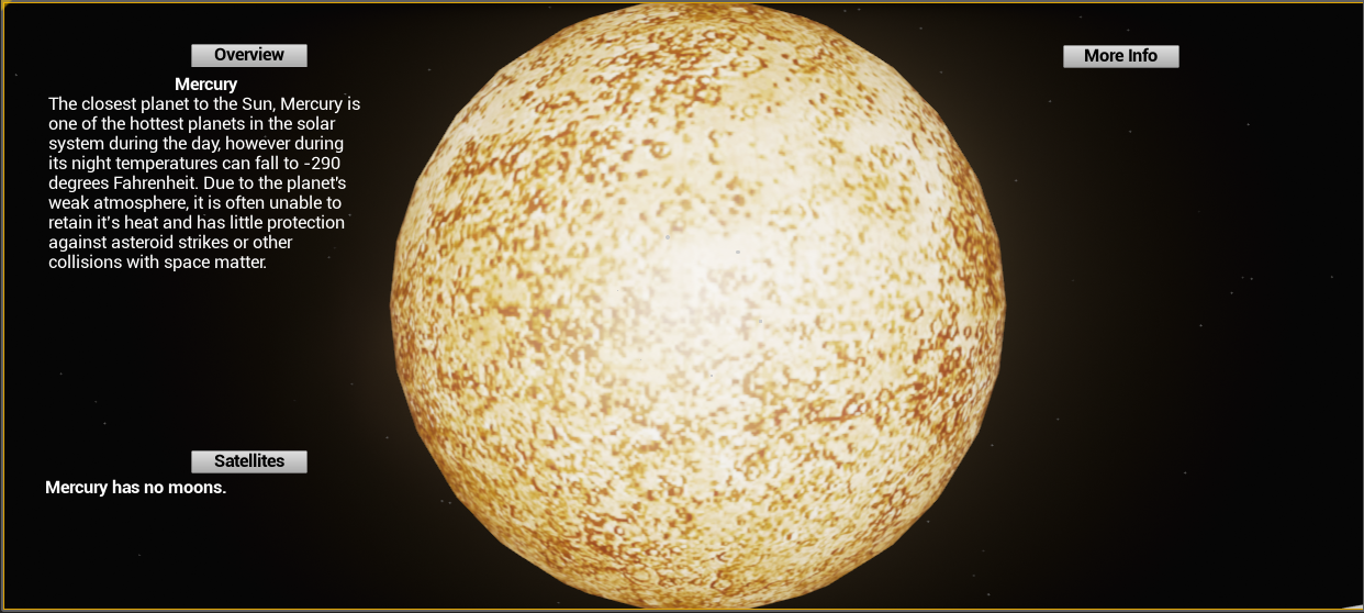 I started out working on the design of the simulation in the Unreal Engine creating the cockpit and menu displays of the spaceship that would serve as our HUD. However as the only one in the group with knowledge of Unreal, I ended up also working on the code. During the year I finished the design of the spaceship, tried to get the ship to move, made a planet map for each in the solar system complete with HUD’s showing information on the planet and made starry background. However I was never able to finish the coding and could not get the ship to move even after a month of troubleshooting and consulting with Unreal coders. However I taught several of the sophomores in the project how to use Unreal and will continue to help out throughout the summer.