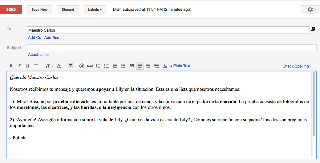 ¡Espere! Yo comprendo que tu quieres promover la prevención del abuso de Lily, pero hay un problema. El papa de Lily da mucho dinero a la escuela, y ni yo ni otras personas sabemos la posición de otras personas en su familia. Además, es importante que tu sepas la posición que tu tienes. Su trabajo es solamente enseñar a los estudiantes. ¡Enseñe! ¡Solamente enseñe!