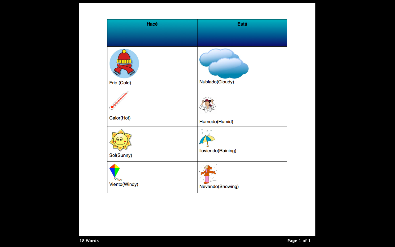 Imagine you are taking a trip to a Spanish speaking country, and you trying to figure out what to wear. But you can not understand what the weather person is saying. If you are trying to figure how to say simple weather then look at the chart below: