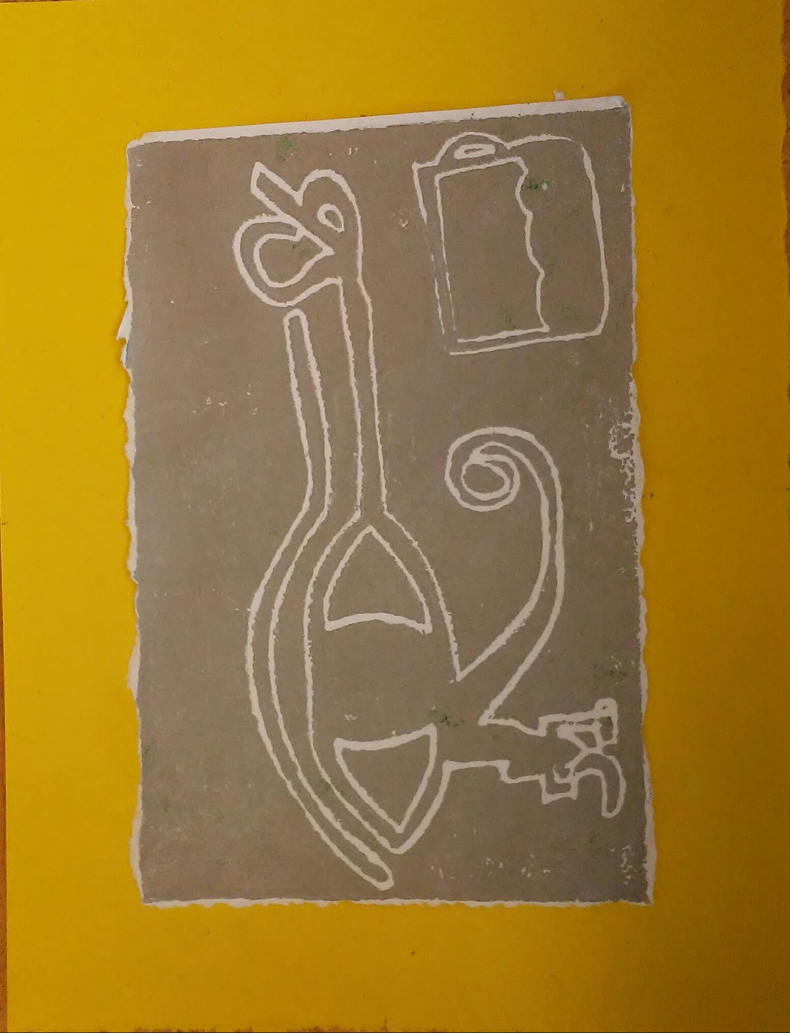When making this print, I sketched a few possible designs for my element. I decided on this because I thought it would give a different type of design then expected. This is something many people didn't know, so I thought it would be interesting design to choose. After choosing my design, I traced it onto a piece of thin foam, backwards, so if you had any words or letters, they would be correctly faced when you made the print. We used a brayer to apply the ink to the foam board, and then placed that onto a sheet of paper and repeated this a few times until we got 3 good prints.