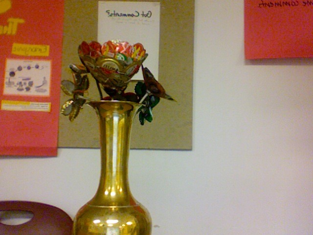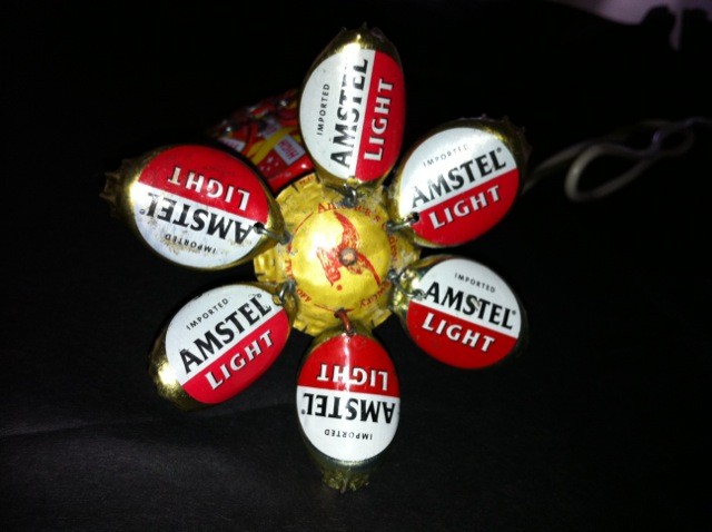 In our senior art class, we were exploring the topic of recycling and the environment, primarily focusing our attention on bottle caps. For my project I choose to make flowers out of bottle caps. Unlike plastic bottle caps, beer-bottle caps can be recycled. Beer-bottle caps are made from steel, as evidenced by their attraction to magnets, and steel is a recyclable material. I wanted to make flowers out of the bottle caps, because quite frankly I think real flowers are a waste of money-they’re beautiful for about a week and then they die. So this bottle cap flowers last for as long as you want. You won’t feel bad about throwing them out either because they can be recycled. My dad helped me with the cutting and flattening of the bottle caps, because he didn't want me working with power tools...but I glued and tied the red bottle caps on the big flower and the medium one.