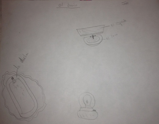 En el baño numero dos hay un lavamanos, un espejo, y un inodoro.