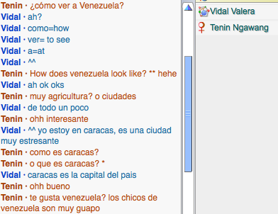 - I spoke with two people but I forgot to screenshot my other chat because I accidentally quitted out of it. I had a nice long conversation with Rafael from Brazil in spanish. He was helping me a lot too but anyway, the chat that I've screenshot is the one below. His name is Vidal and he was from Venezuela.What did you learn about them? What did you learn from them?