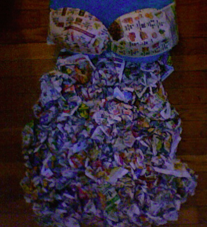 For this piece I used recycled coupon newspapers and and glue. It was't easy trying to shape and form the news print paper into the style I wanted so the design changed quite a few times. My end design became a two piece garment, a bandeau top and ruffled bottom. Creating the dress in paper signified the first design and the first idea will last forever but it can always be changed and made better and that goes for things that happens in life.