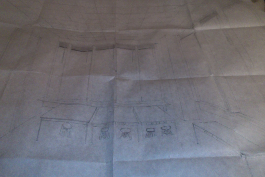 d. My advice to someone who has never drawn a one point perspective drawing is to always start your lines on a new object with the vanishing point, and let the size of the room guide you on the size and shape of the object that you're drawing.