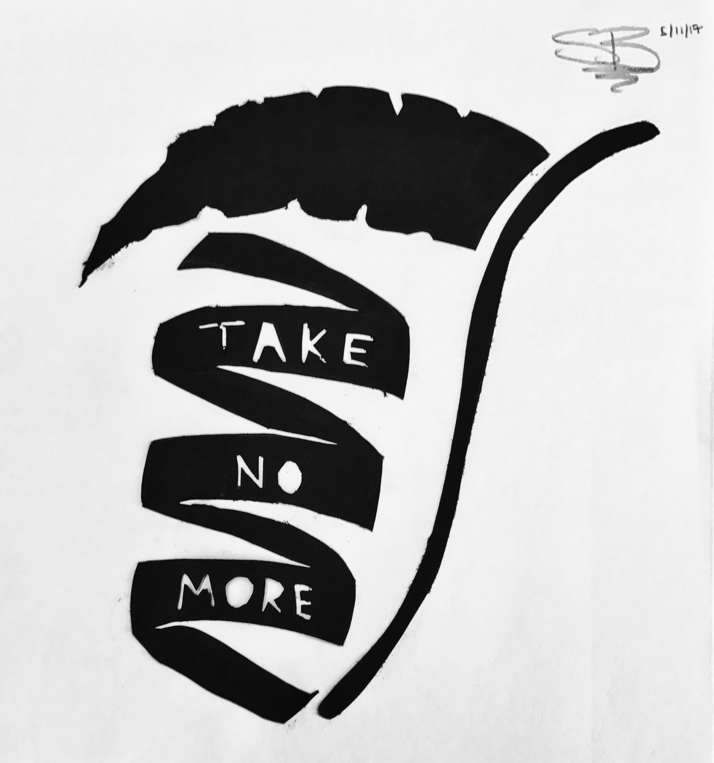 I knew that I wanted to do something relating to that theme. With my first sketches, I kept negative space in mind but didn't draw my image around it. In one of the previous assignments where we had to practice cutting out negative and positive space, I had some trouble figuring out what parts should be positive or negative. My other sketches were complicated and intricate, and knowing that I had so much trouble with the practice version, I wanted to have as few pieces as possible. The ribbon, scythe, and quote remained throughout all of the versions, with varying amounts of detail and added elements. I found that have the three pieces, without anything else, would be the most powerful because there aren't any distractions.