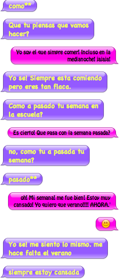 This week was about responding right away. With out being able to have to think or re-read the spanish and just comprehending it. Since it was this my partner, Isa and I just had a conversation. I happen to be seeing her this weekend so we kind of talked about that. (All in spanish, of course!) I thought it was going to be hard, but I learned that I do know more spanish than i thought and that I actually can have a back and forth conversation with out taking forever to reply. It was really excting to know that I could do that because I came in with low expectations because of my thoughts and came out of this conversation with high expectations. My partner Isa was proud we were having a back and forth conversation with out me taking FOREVER to reply and her just sitting there. It was good to know that I can have a normal conversation in spanish! :)
