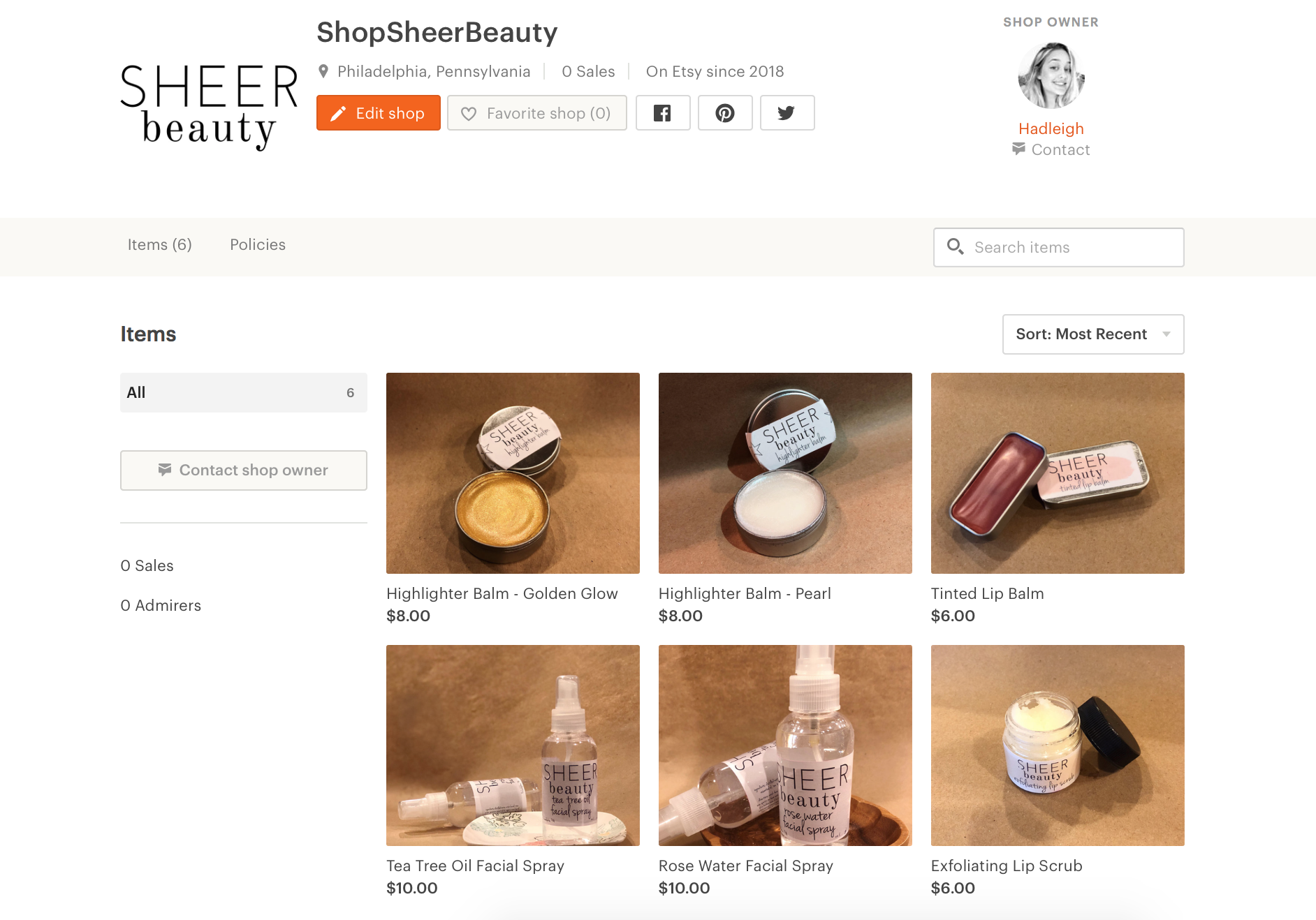For my capstone I have created a handmade makeup and beauty brand, called Sheer Beauty, containing products such as tinted lip balms, lip scrub, highlighter balms, and skin rejuvenating facial sprays that are sold on my etsy site (which is currently hidden as I am still working out minor details regarding shipping and costs):