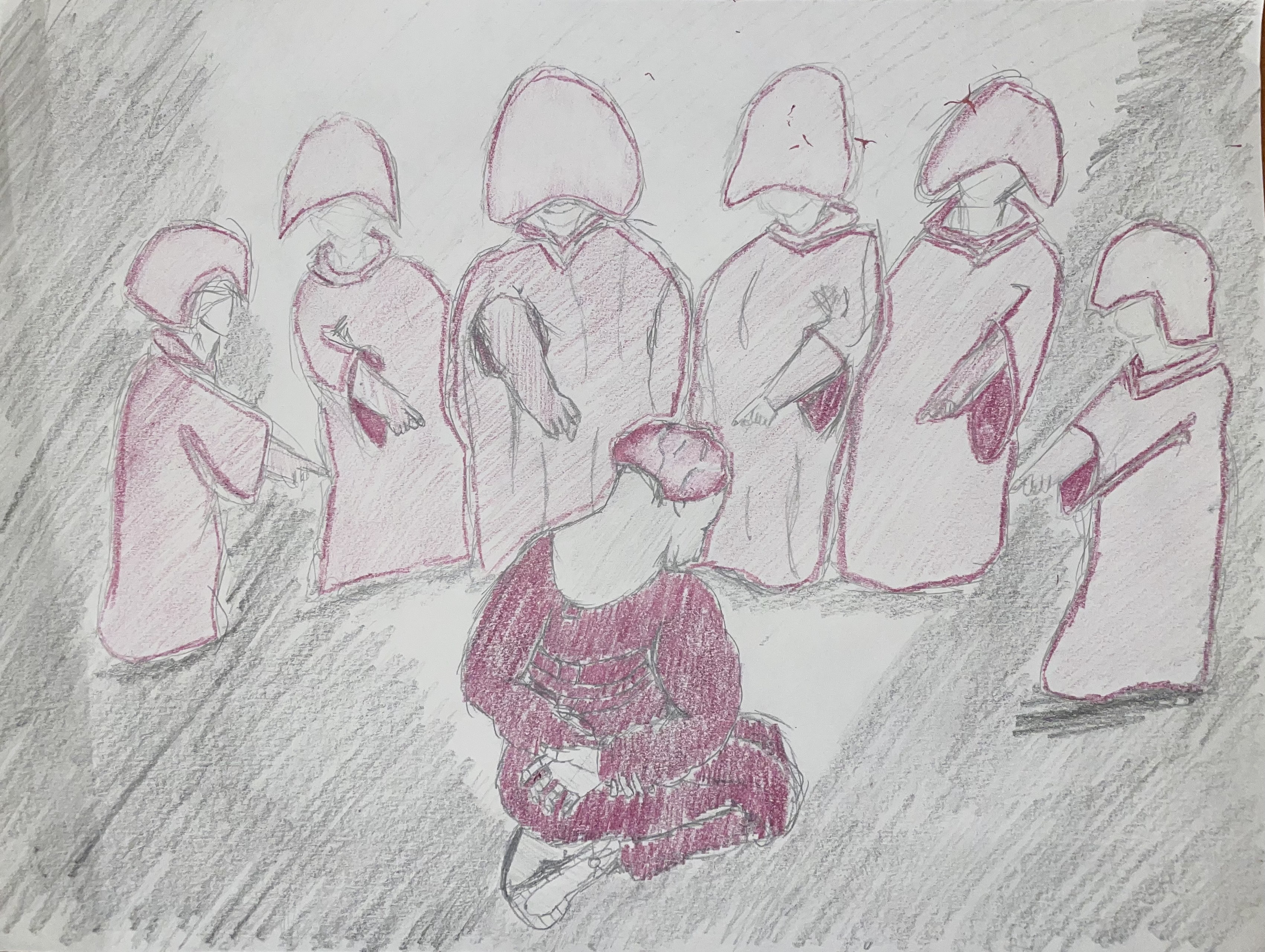 As the maids stand in a circle, they point and blame Janine for being what would be known as unwomen. This is after she openly talked about how she was raped at fourteen, giving her an unwanted pregnancy which led her to have an abortion, something that was her full right. In the society of Gilead, pregnancies are sacred, if either the mom (maid) wants it or not. This secret which was told by Janine herself, brought her a sort of consequence. As she kneeled down, with her hands behind her back Martha could see. Everyone surrounds her and starts to chant, “Her fault” as they all point at her. “Last week, Janine burst into tears. Aunt Helena made her kneel at the front of the classroom. Hands behind her back, where we could all see her, her red face and dripping nose. Her hair was dull blond, her eyelashes so light they seemed not there, the lost eyelashes of someone who’d been in a fire. Burned eyes. She looked disgusting: weak, squirmy, blotchy, pink, like a newborn mouse. None of us wanted to look like, ever. For a moment, even though we knew what was being done to her, we despised her” (Pg.72) This scene demonstrates and shows a lot about what the book is all about. Women mentally abusing women, women being controlled by a society that denies their right to their bodies, and shames them if they oppose this new society’s ideologies. But no one is to blame these maids who shame Janine because they have been shamed/scared in order to follow the established beliefs, of being objects to give birth to children. For my first Lit log, I demonstrated this scene, in order to show the visual representation of how Janine would have looked and felt. In my drawing, she kneels down in front of six maids all pointing at her with their red long dresses that cover every inch of their bodies. Whitecaps cover their heads and eyes. I shade the sides of the paper in dark and in a triangle shape leaving blank up into where Janine is kneeling. This is to demonstrate the attention that she is being given. But not the good type of attention, the one where she is being stared at and it makes her feel uncomfortable around all the maids, chanting at her about how she’s a crybaby. As well as the shading of the drawing, the maid’s dress color is more light red, meanwhile Jenina is bright red in order to show her apart from the others. To put her in the spotlight of the drawing, her hands can also be seen behind her, giving the viewer perspective of her hands, in a way we are the ones who see how she’s helpless. It’s a cycle of fear, Janine is humiliated, scared, meanwhile as Aunt Lydia states in the passage. “ You are an example”, an example to all the other women to not go against the beliefs. Especially when it comes to abortion, where the punishment is death, for both the maid and the doctor who decides to help. The maids will know not to commit the same “crime” or they will have to face a punishment.