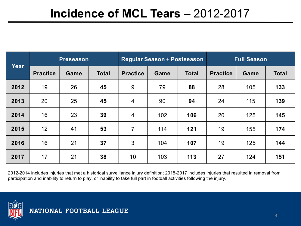 A medial collateral ligament (MCL) tear is more common among people who play football. You can tear your MCL if you get tackled and land the wrong way, or if you jump and the land the wrong way. MCL injuries are more common than ACL injuries and can be treated in better ways. If the tear is just slightly injured, then you can just wait to let it heal. Surgery is not usually required even for more severe cases. It is only requested if the person wants the MCL to heal faster. Last season, there were 151 MCL tears in the NFL. Even if MCL tears are not the most severe injury, that is too many tears.