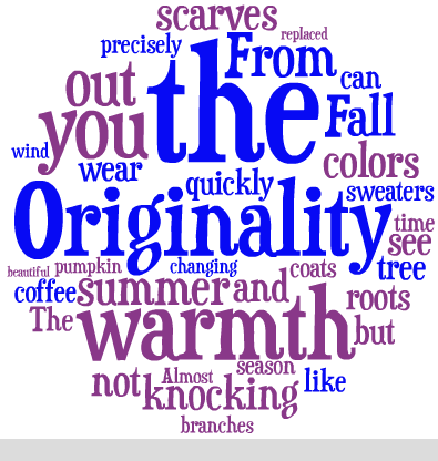 “From the roots of a tree to the branches of it, you can see the changing colors of the season. Almost time to wear coats but not precisely. It’s like knocking the wind out of you. The warmth of summer so quickly replaced by the warmth of sweaters scarves and pumpkin coffee. Fall is beautiful.” was one of the things that I wrote in my journal. I learned so much from this unit as well. Not the changing colors because of the seasons but how fast something can change. Like I changed throughout my sophomore year. It wasn’t a negative change nor positive. But it was an original change. The originality of specific things. Originality is pushing yourself beyond personal boundaries.