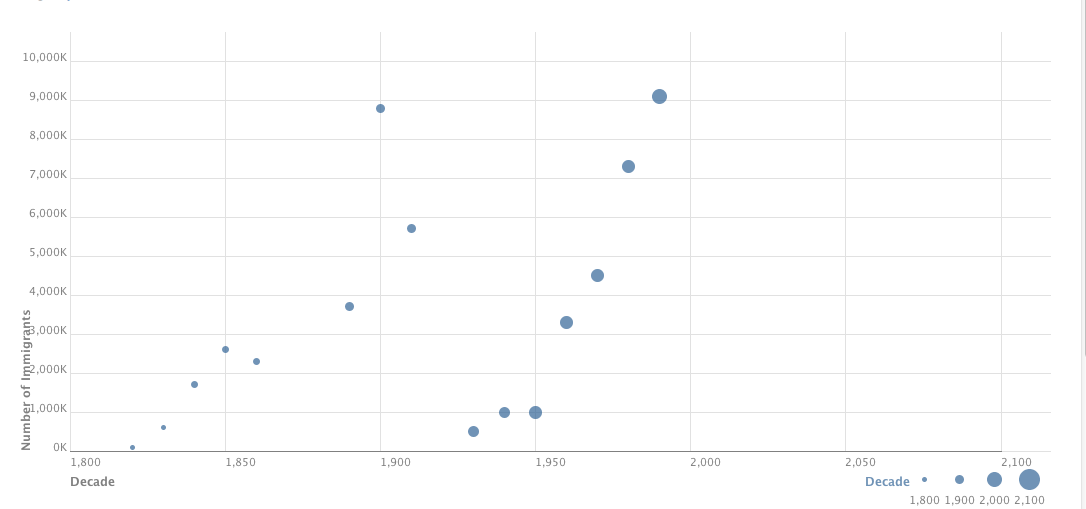 I think overall this was a good project. When we began to look through history and see what happened it became clear what influenced the immigration rates. A lot of it was due to wars and military action. That was really interesting to me. The challenging part was coming together to create a visualization of our data. I think if we had to do this project over again, we would have used a different program to create our visualization. Although ManyEyes was cool, it was frustrating over 90% of the time. Often we would be stuck reformatting our data and re-entering it into ManyEyes. Because we were so set on using the treemap, we didn't think of trying something else. After we realized that this wasn't working out, we tried a bunch of other formats until Ms. Laufenberg showed us the scatterplot thing. That worked the best so we stuck with it.