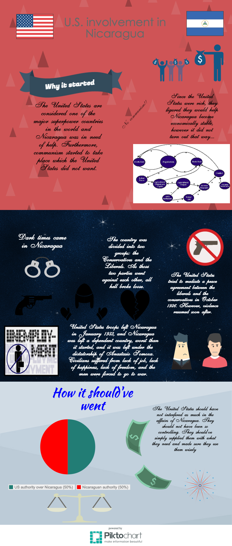 During the research I found out many interesting things, for example I learned that there was often issues in Nicaragua because of the mindset that so many of the presidents had. They thought that they could have dictatorship over the country, over the nation and the people were not at all going to agree with that. That caused a constant change of person in charge. Furthermore, I learned that the United States were very involved in helping to make these decisions as if Nicaragua was their own country. The United States were very controlling and caused Nicaragua's situation to worsen. Enjoy my infographic.