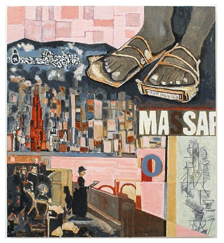 En esta obra yo no veo muchas cosas. Veo las pies de una persona. También veo una sección que tiene mucho, gente asentado. Hay muchos formas diferentes, como los cuadrados, los rectángulos, y los círculos. Los colores son una mezcla de brillantes y apagados. Están muchos colores en esta pintura, como rojo, negro, azul, y rosa. El tono de esta pintura es ocupado. Parece ocupado por que hay muchas cosas que aparecen en esta pintura. Hay una persona con zapatos en la obra también. En la pintura yo veo modelos diferente. En el parte fondo veo un tribunal con mucha gente. Abajo en le obra se ves un mapa. En el zapato, hay una mensaje que dice “Keep Moving.” Pienso que la pintura sobre todos es una mensaje para moverte en la vida.