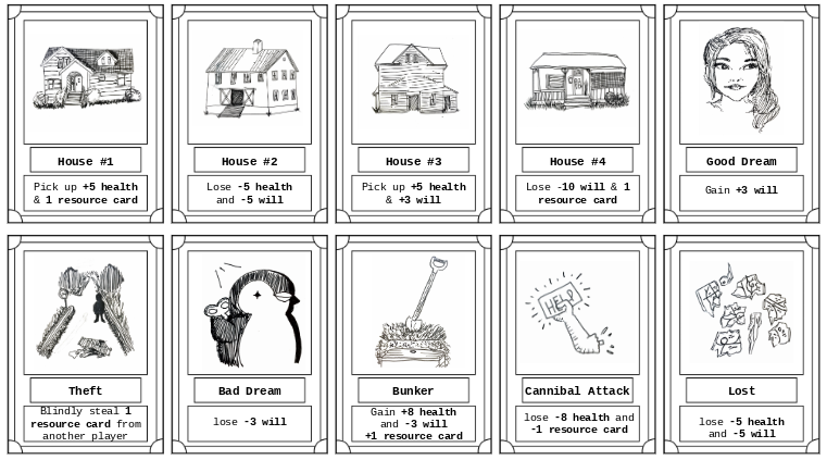Event Card: The players have the ability to make some choices that can involve strategy, morality, knowledge, luck, and skill. The characters in The Road were often faced with decisions and their needs heavily influenced their actions. Two of the major components in It’s Not Blue are will and health. While reading The Road, you can see how frequently events occurred that affected the will and health of the man and the boy. We wanted the players to experience the challenge of being affected by an event because of the cards they were drawn. Hence, the purpose of the event card. The outcome of the event is determined by how many will and health points you gain or lose.