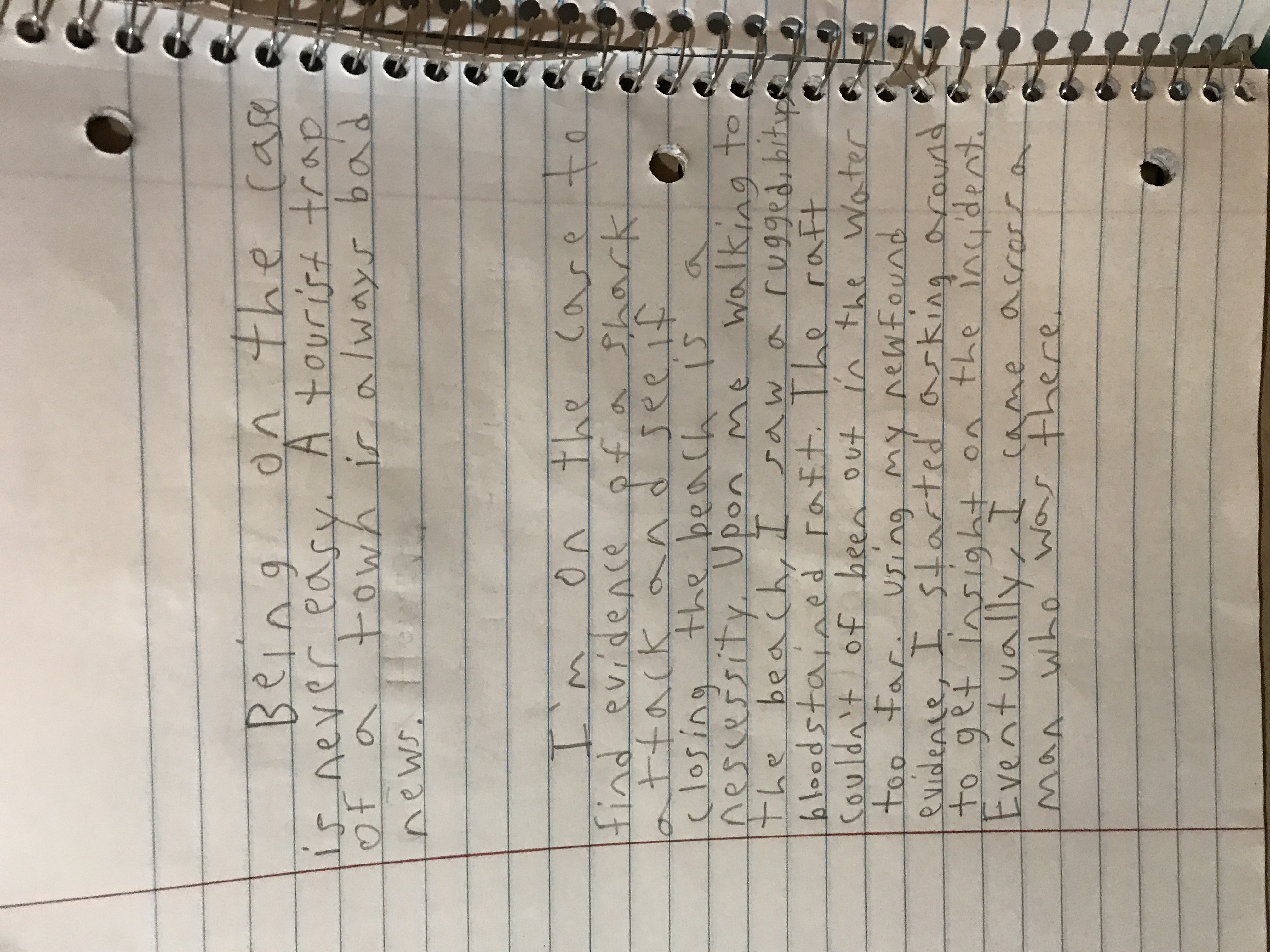 In my storyboard, Roy starts gathering information by investigating the raft washed up on the beach. Roy then decides to ask some locals until he stumbles upon the guy who lost his dog to the shark. The two engage in a conversation but the man is unwilling to talk until Roy asks if his dog was missing. The information Roy receives from the man then eventually leads him to the woman who lost her son to the shark. After asking her, she tells Roy, causing a flashback to occur. She tells that on the foggy day at the beach, when Alex went into the water with the other kids, things seemed alright until she noticed the commotion picking up. Everyone ran to the edge of the water and the kids all ran back to the shore. All except for Alex who never returned.