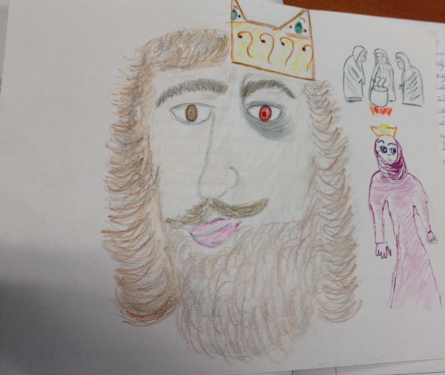 This was my Macbeth Creative Project and this is a drawing of Macbeth's transformation. On one half, Macbeth is himself; Thane of Glamis and Thane of Cawdor. He was content with being those two titles. On the other half, is when he became corrupted with being Thane of Glamis, Thane of Cawdor and King of Scotland, which in the beginning he was given those 3 prophecies. That side also shows some of the things that might have turned Macbeth to the dark side.