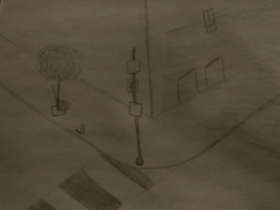 -I really enjoyed drawing my 2 point perspective because I'm naturally good at drawing buildings and such. My favorite part was drawing the shadow.