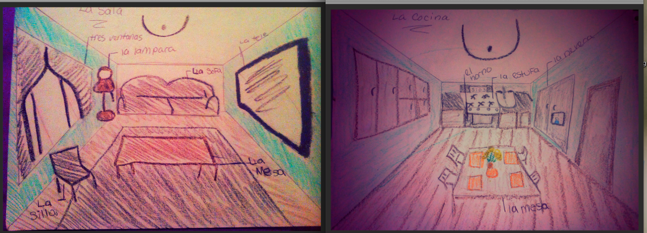 .Hay sala es muy extravagante. Tiene un sofá, un mesa, un tele, tres ventanas, un silla, y un lámpara.