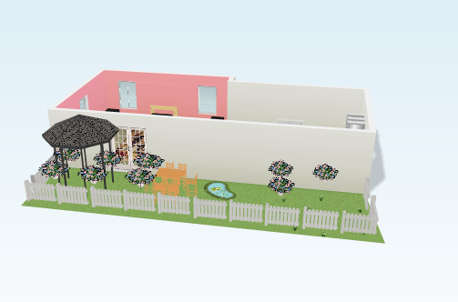 El jardín en el casa de Sydne Ella tiene muchas flores en múltiple colores. En rosa, rojo, Blanca y Amarillo. Hay un estanque también con pescados.