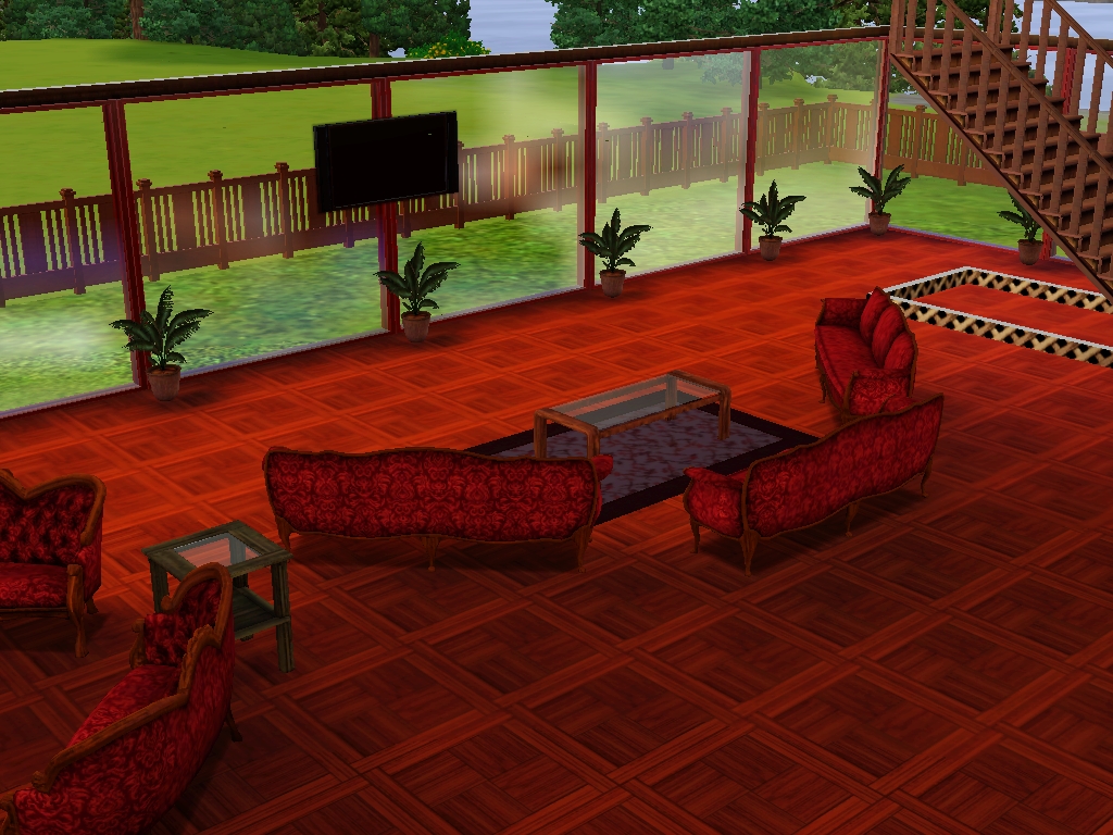 * Es a mediano cuarto, con un television, una sofa, lampara, la mess, sílla y plantas. Un colores de cuarto es rojo.