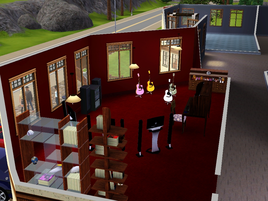 *Es así así pequiño, uno ventanas, con la guitarra, estudio de musica, sistema de música. Un colores de cuarto es cafe o oscuro rojo.