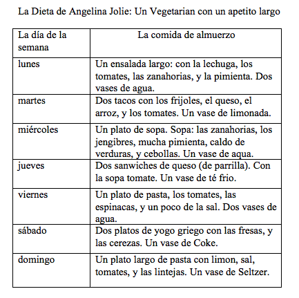 La dieta de Angelina Jolie Posted by Emalyn Bartholomew in Spanish 1 - Manuel on Tuesday, April 17, 2012 at 9:57 pm Screen Shot 2012-04-17 at 9.56.34 PM Comments No comments have been posted yet. Log in to post a comment.