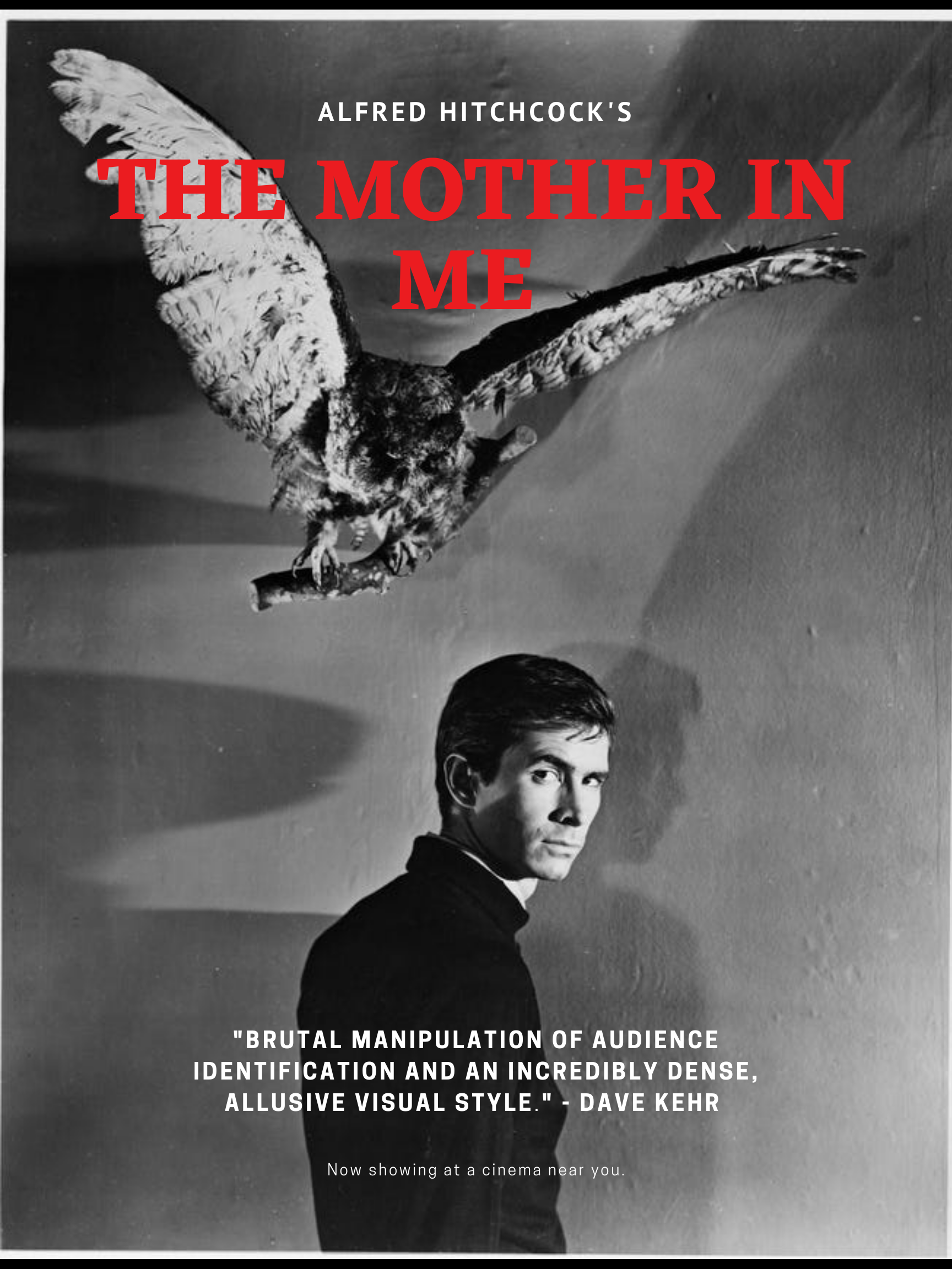 There is no doubt that “Psycho” is a psychological thriller. It even says it in the name. When looking at the original movie posters for this film, they usually showcase a bright font over a heavy black-and-white image of some iconic part in the movie- usually the shower scene. For my poster I thought it was best to not give anything away. And that is exactly why I choose Norman with his taxidermy owl. It foreshadows the creepy events that are showcased in this movie, without telling us what might happen. The image itself is intense enough to lure people into watching it. The quote and fonts just add more detail and description. As for the title, I wanted to go with something that was mentioned in the movie. I do think Psycho is very fitting, but as I watched this movie, the term did not seem to be used and I believe I could come up with something more relatable and creepy. I chose “The Mother in Me ” for many reasons. As the case of the murder is solved, the audience finds out about the psyscology aspect for Normans behavior. It is explained to Sam and Lila that Norman experienced trauma from his mother at a young age which causes him to act as a second identity in ways that resemble his mother, who is deceased. In today’s terms we would call this “multiple personality disorder”. Without this disorder, there would be no movie, soley why I wanted the title to relate to Norman’s disorder. As you look at the subtle details of this poster, you may notice the two shadows that fall behind Norman. The owl above him only has one shadow. I believe that Norman has two shadows because of his split personality and the ways in which he resembles his mother and himself, but wrapped in one body. Symbolism like this is always something that should be included in a movie poster. It is vital that the audience has some small sense of what is to come, especially if it is a thriller. This poster would be more appealing to the general public based on these small changes I made. There are very iconic characteristics that go into every classic horror poster. Including the large red font and intense image that sets the background. All of these details set up a clear direction for the viewers of this film and future viewers.