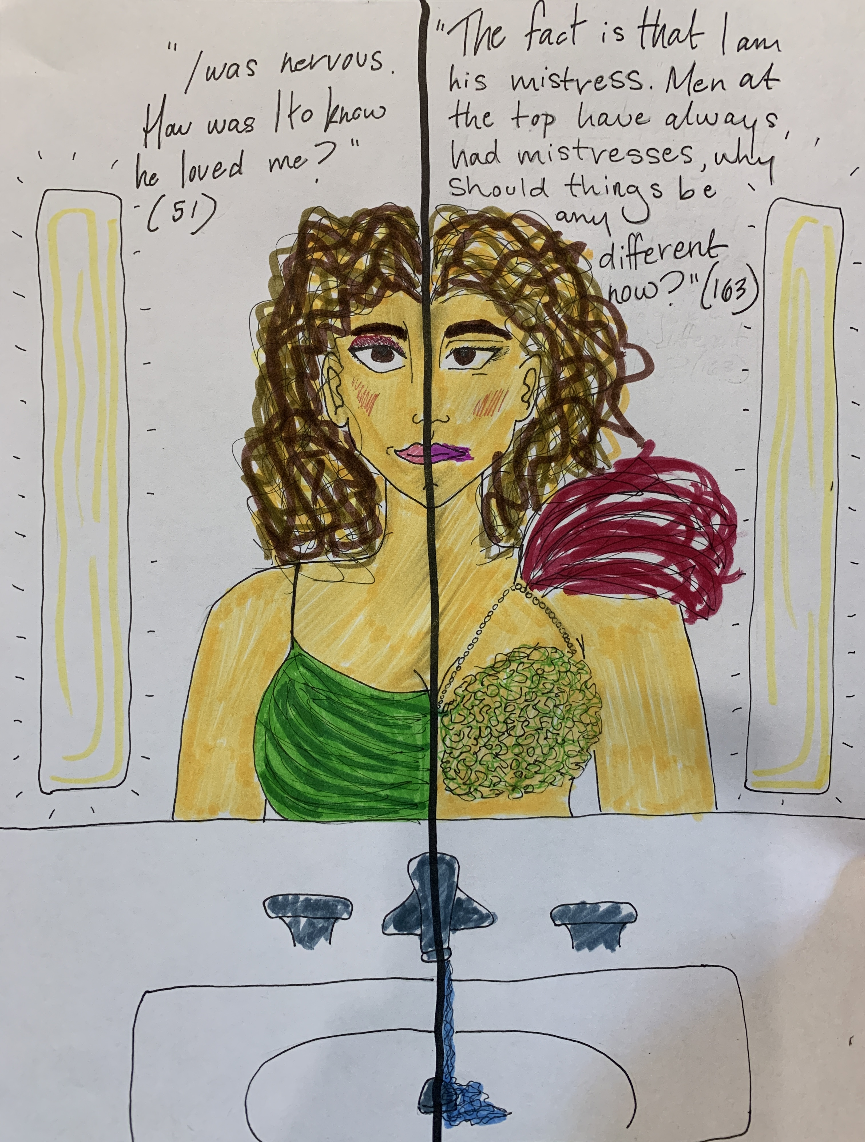 My artwork is symbolizing how the Commander is replacing Luke in Offred’s life. Seeing as the Commander took her to the hotel where she would have affairs with Luke, I thought it was fitting to draw Offred looking at herself in the mirror side by side, the left being in “the time before,” and the right being in Gilead. Each quote I chose to put on either side of the mirror is significant in that it is her inner thoughts towards each man in these two periods of her life. The quotes highlight Offred’s cynicism, which only grew with her new role in Gilead, as a surrogate for the Commander’s Wife’s child. In the past, she was naive, and was only worried about whether or not Luke loved her, but now, she is thinking of the whole picture, and appears rather resigned about the whole thing.