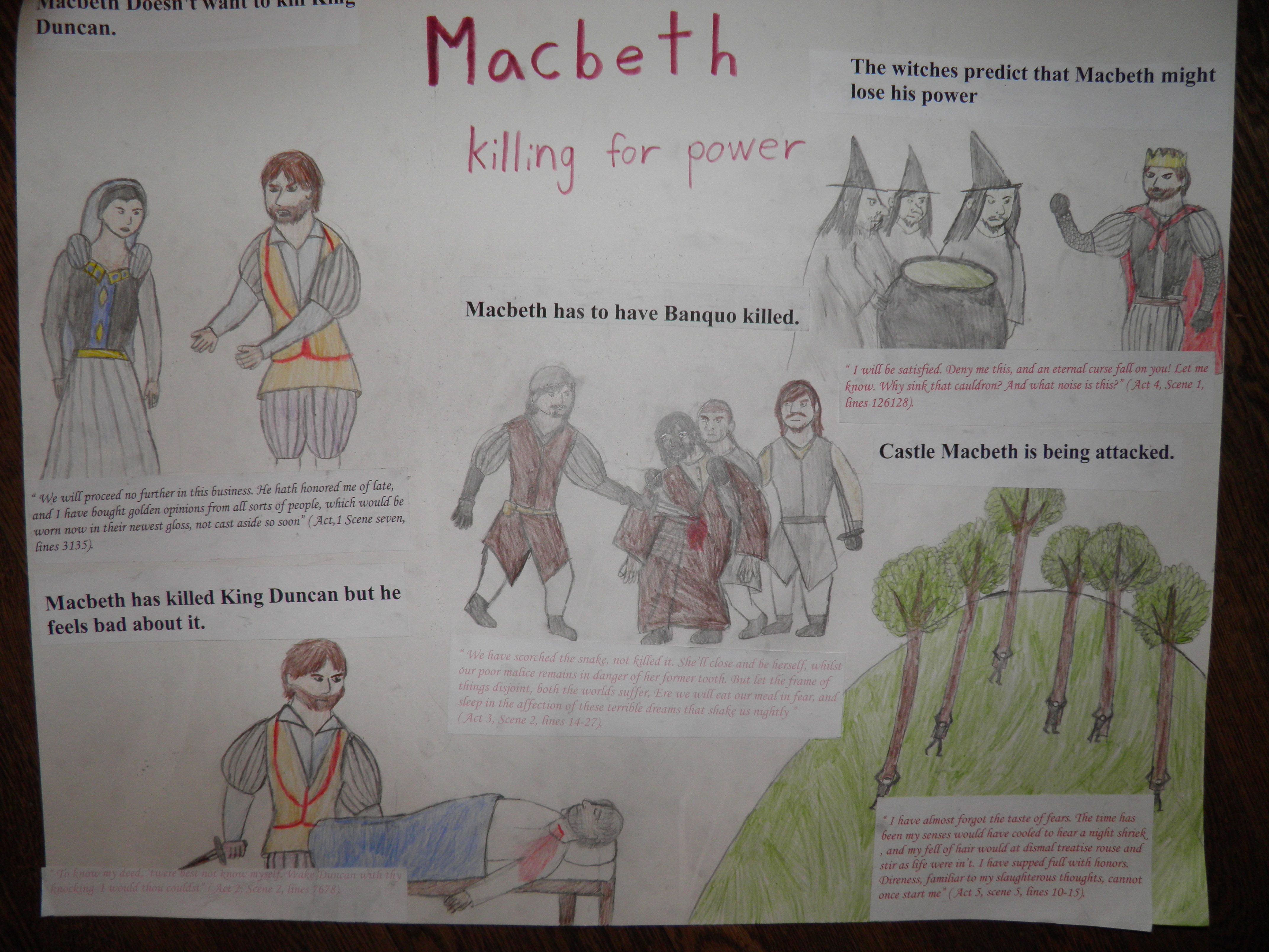 For making the poster I first mapped out where I was going to put everything. Then I made rough sketches of each of my drawings in pencil. I finalized them, and added the quotes. I like to draw, so the drawing part of the project was pretty easy. It did take awhile to draw illustrations for all five scenes though. I also had to research Shakespearian clothing, and decide what I wanted each of characters to look like. By doing some research, and allowing a lot of time to be put into this project, I got it done.