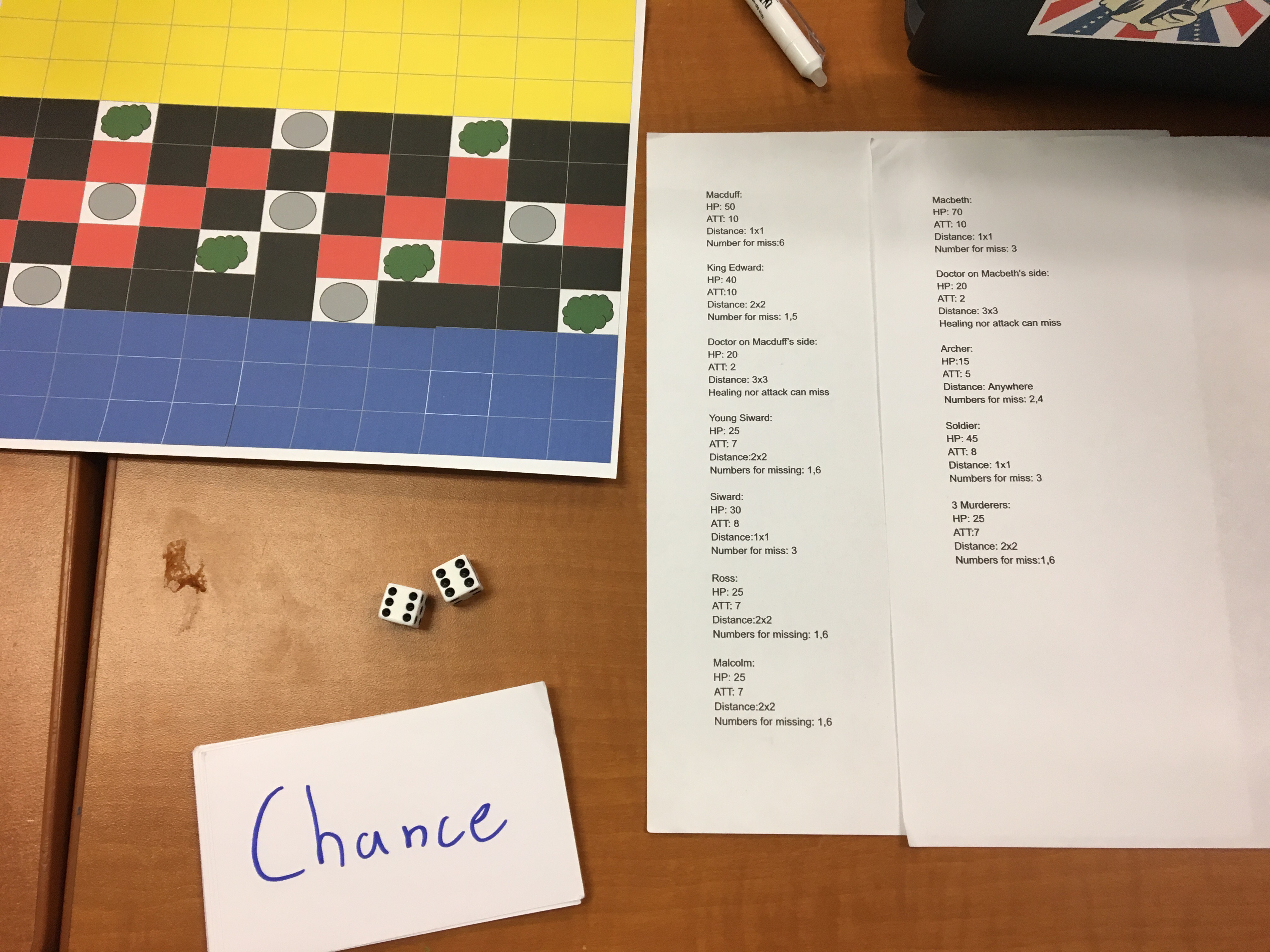 We also added chance cards as well so people can have some advantages and disadvantages. Some chance cards works really well with some players and don’t work well with other players. With the chances cards if Macbeth picks up with cards that have Lady Macbeth, the 3 witches, ghost banquo, 3 murderers, and Dunsinane (Macbeth Castle) then he gets a advantage on the other team and for Macduff if someone picks up the card for Birnam Wood, doctors, and the bad witches then Macduff gets a advantage as well so it makes the game fair.